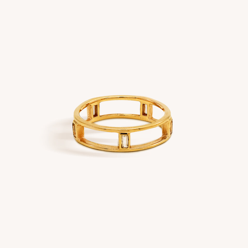 With its sculptural open silhouette and clean architectural lines, this piece brings a modern edge to your everyday stack. The negative space design creates contrast and light, allowing the baguette-cut white topaz to stand out effortlessly. Bold yet refined, it’s a ring that feels both intentional and easy — the kind you reach for without thinking, and never want to take off.